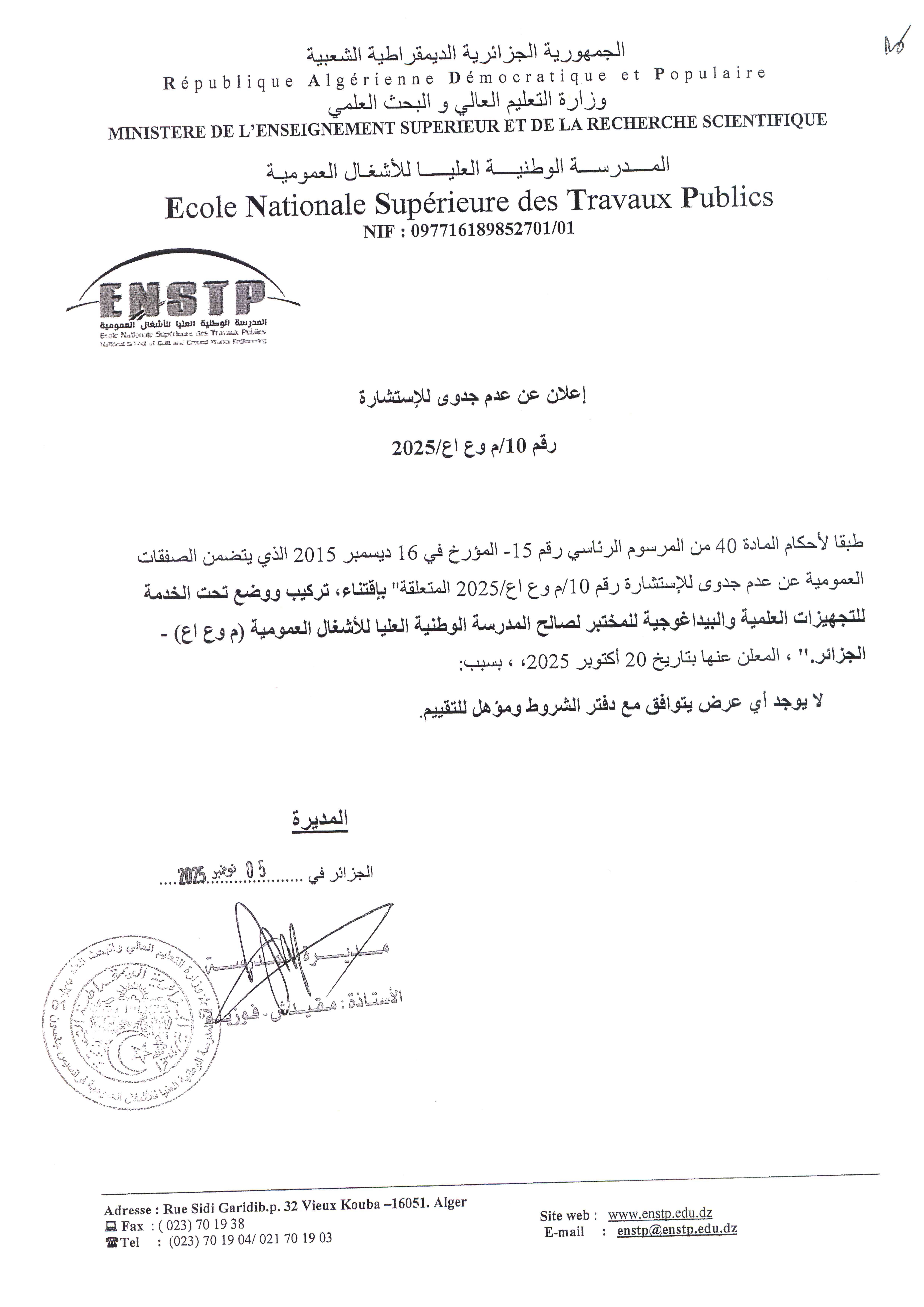 AVIS D'INFRUCTUOSITE DE LA CONSULTATION N°10/ENSTP/2025