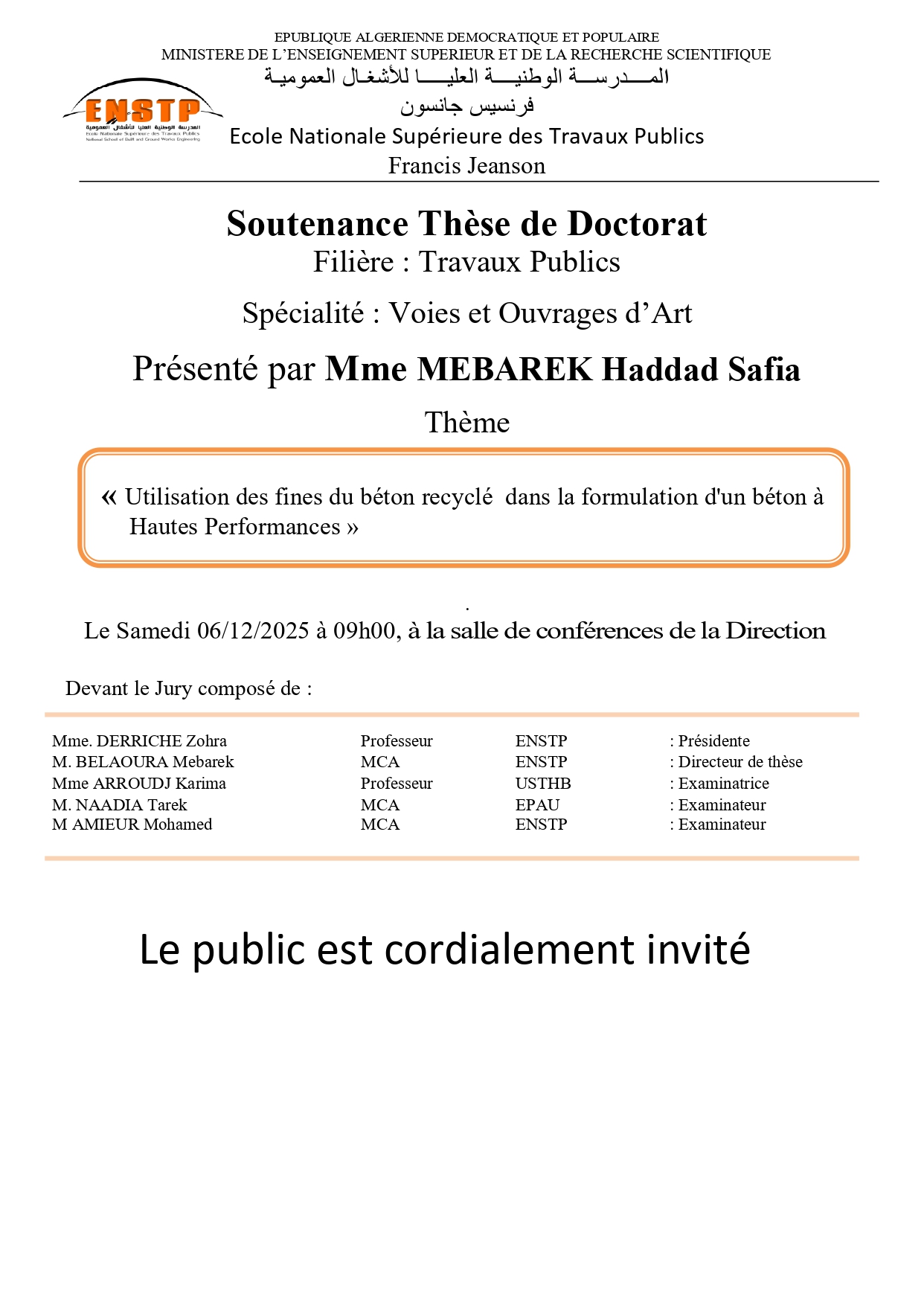 Doctoral Thesis Defense Presented by Mrs. MEBAREK Haddad Safia