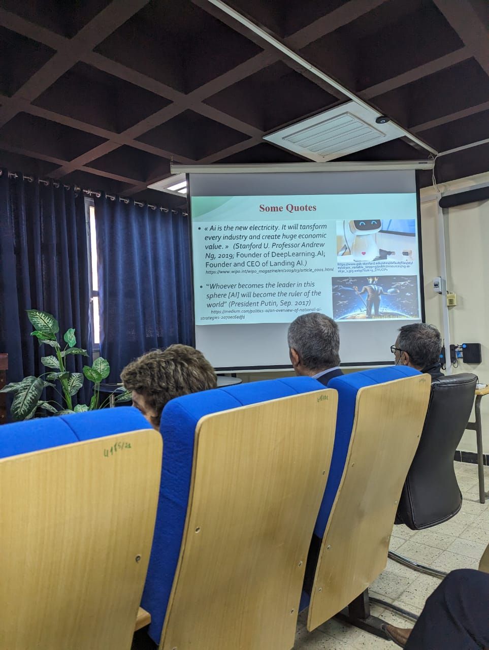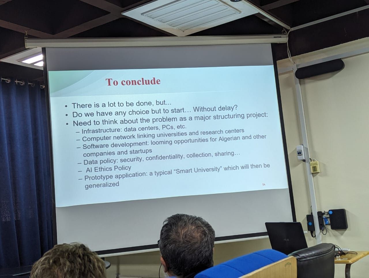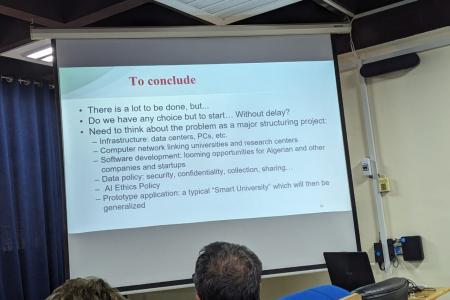En se projetant vers l'avenir, le conférencier a abordé la question de l'IA dans le contexte algérien, en dressant un premier bilan de son intégration et en mettant en avant les défis particuliers que cela implique. Il a souligné l'importance de considérer ce défi comme un projet d'envergure, en mettant en évidence plusieurs axes essentiels :