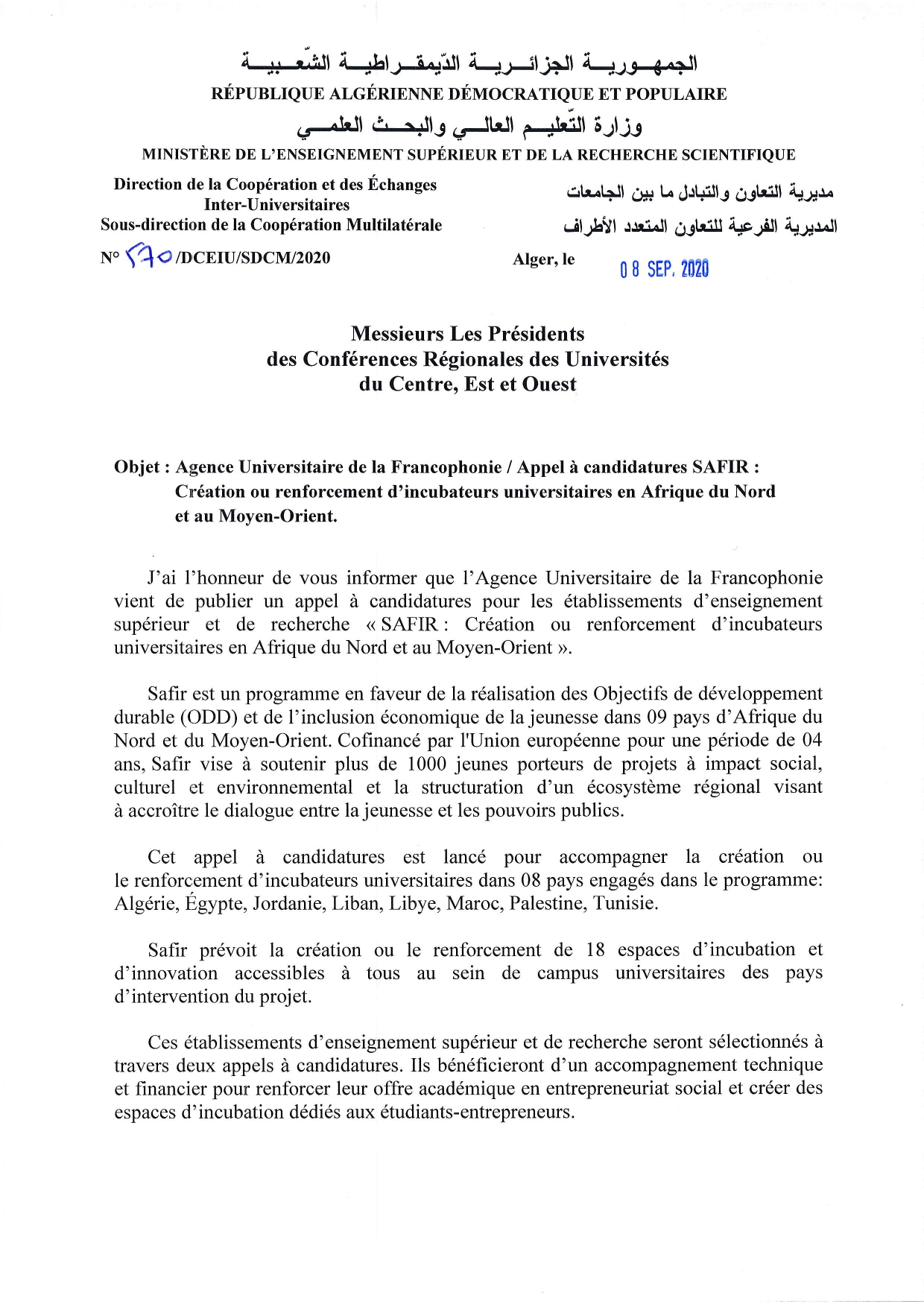 Je vous prie de trouver, en attaché, courrier de Monsieur le Directeur de la Coopération et des Echanges Inter-universitaires/MESRS portant sur l'appel à candidatures "Création ou renforcement d’incubateurs universitaires en Afrique du Nord et au Moyen-Orient".
