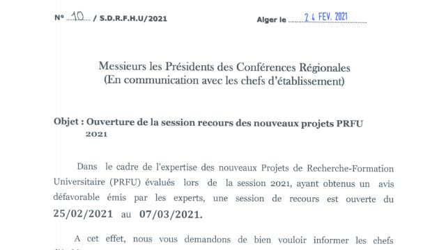 Ouverture de la session recours des nouveaux projets PRFU 2021